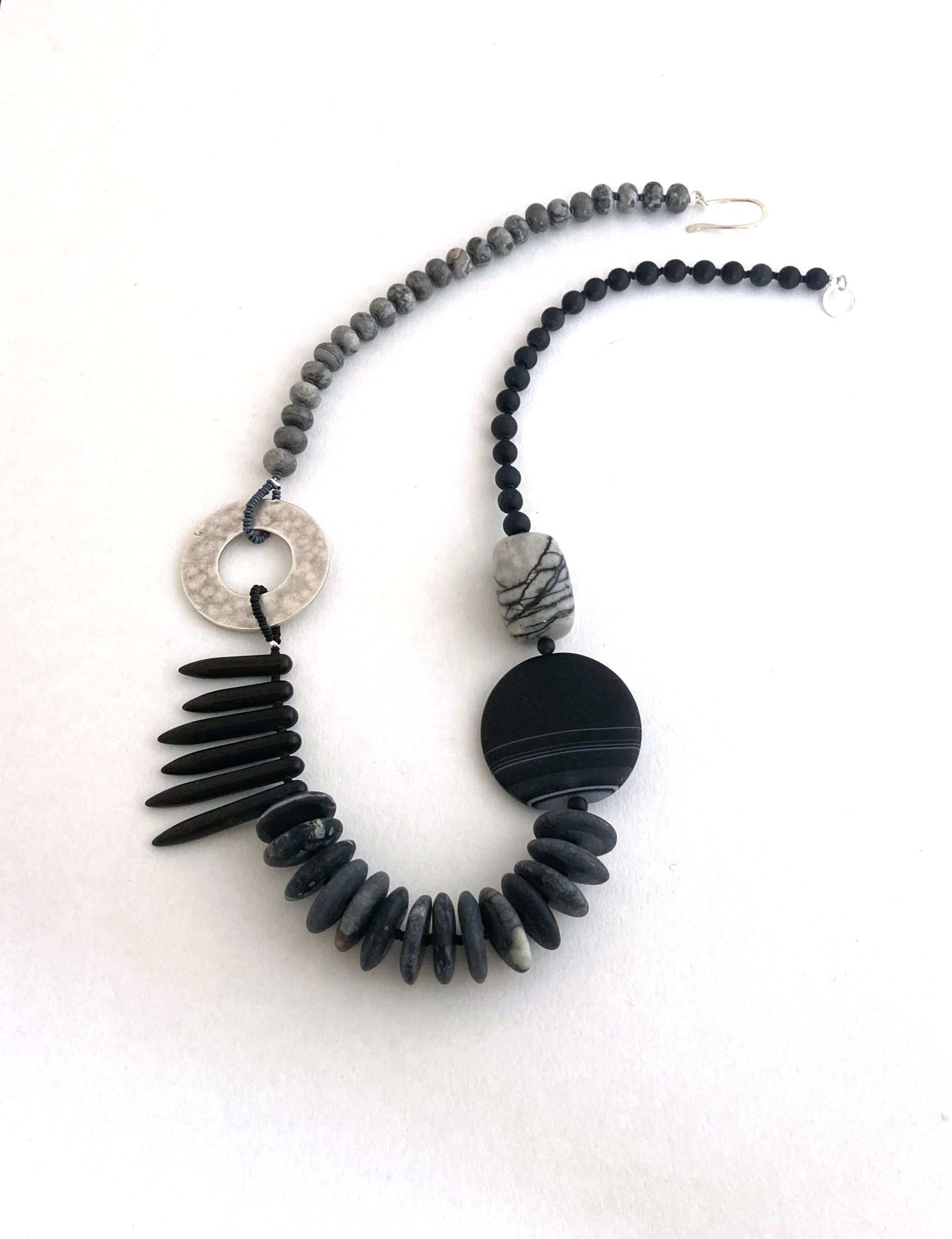 Picasso jasper, black stripe agate, black line jasper, onyx, antiqued silver metal circle, recycled sterling silver hook and ring clasp