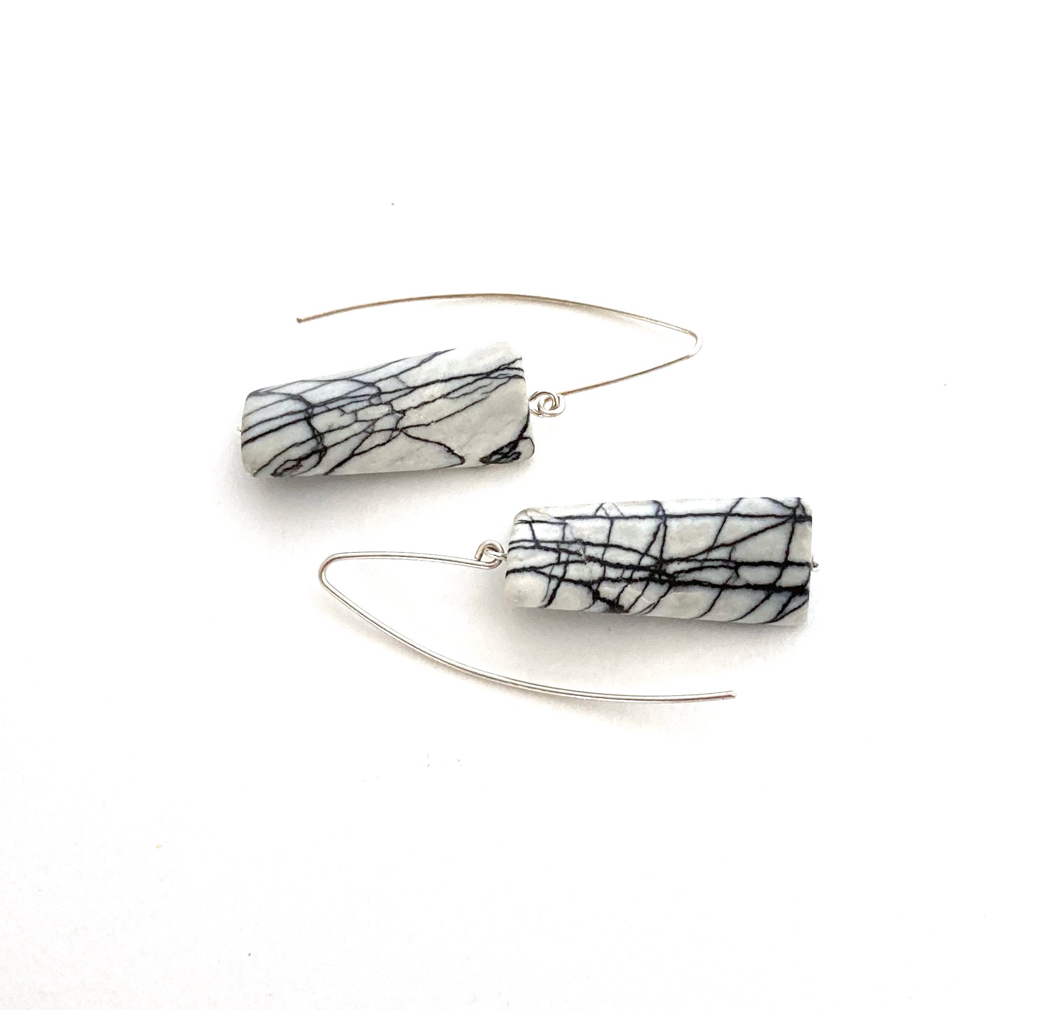 Black line jasper twisted rectangle earrings handmade by Melissa James with recycled silver