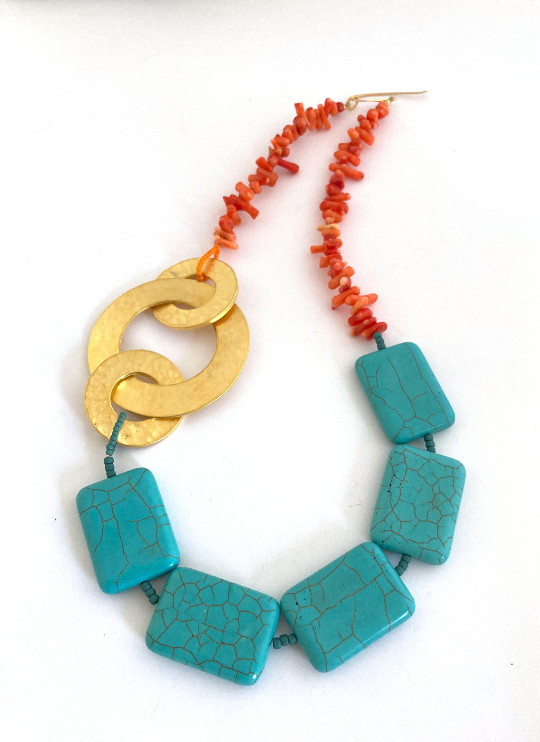 Statement necklace of coral, turquoise and 3 gold hoop circles