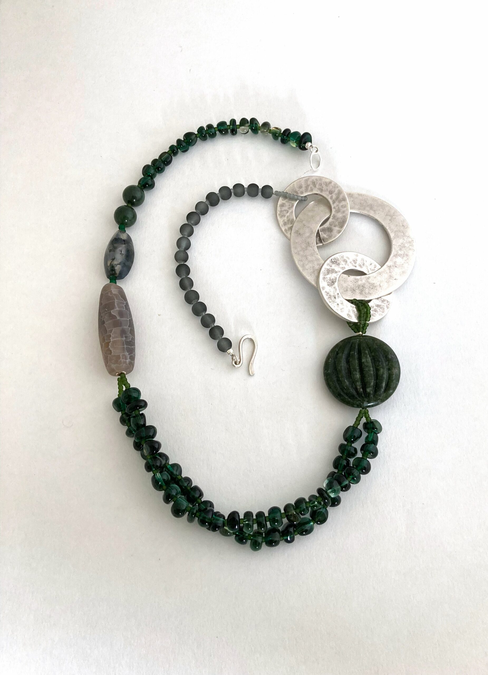 Green agate, grey snakeskin agate, nephrite jade, 3 ring antique silver metal , frosted glass necklace, recycled silver hook and ring clasp handmade by Melissa James