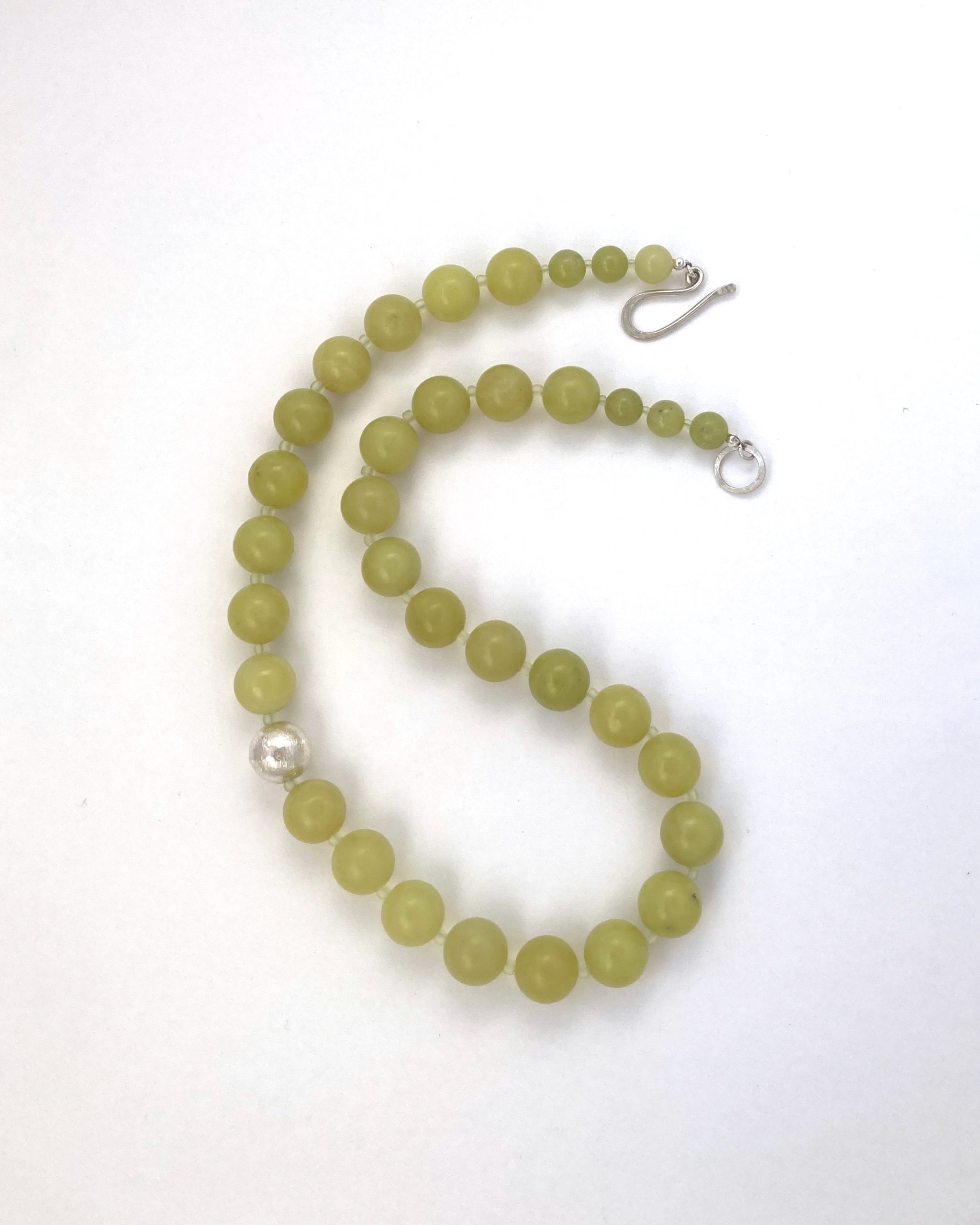 Olive jade pod necklace with brush silver metal accent bead and finished with sterling silver hook and ring clasp. The stones are 12mm in diameter