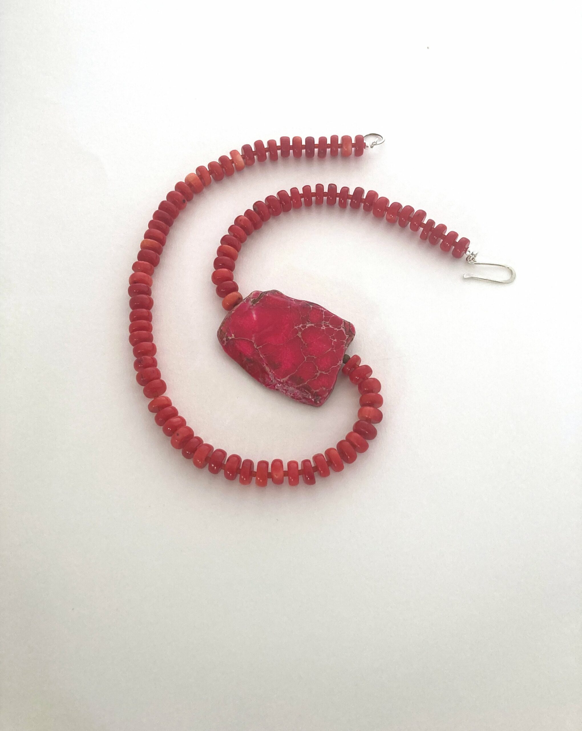 Red coral disc necklace with impression jasper accent stone finished with hammered sterling silver hook and ring clasp handmade by Melissa James Jewellery