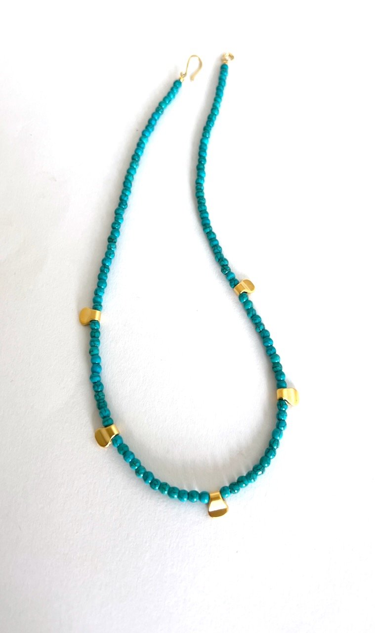Turquoise necklace interspersed with gold pinched nuggets and finished with a handmade hammered gold hook and ring clasp