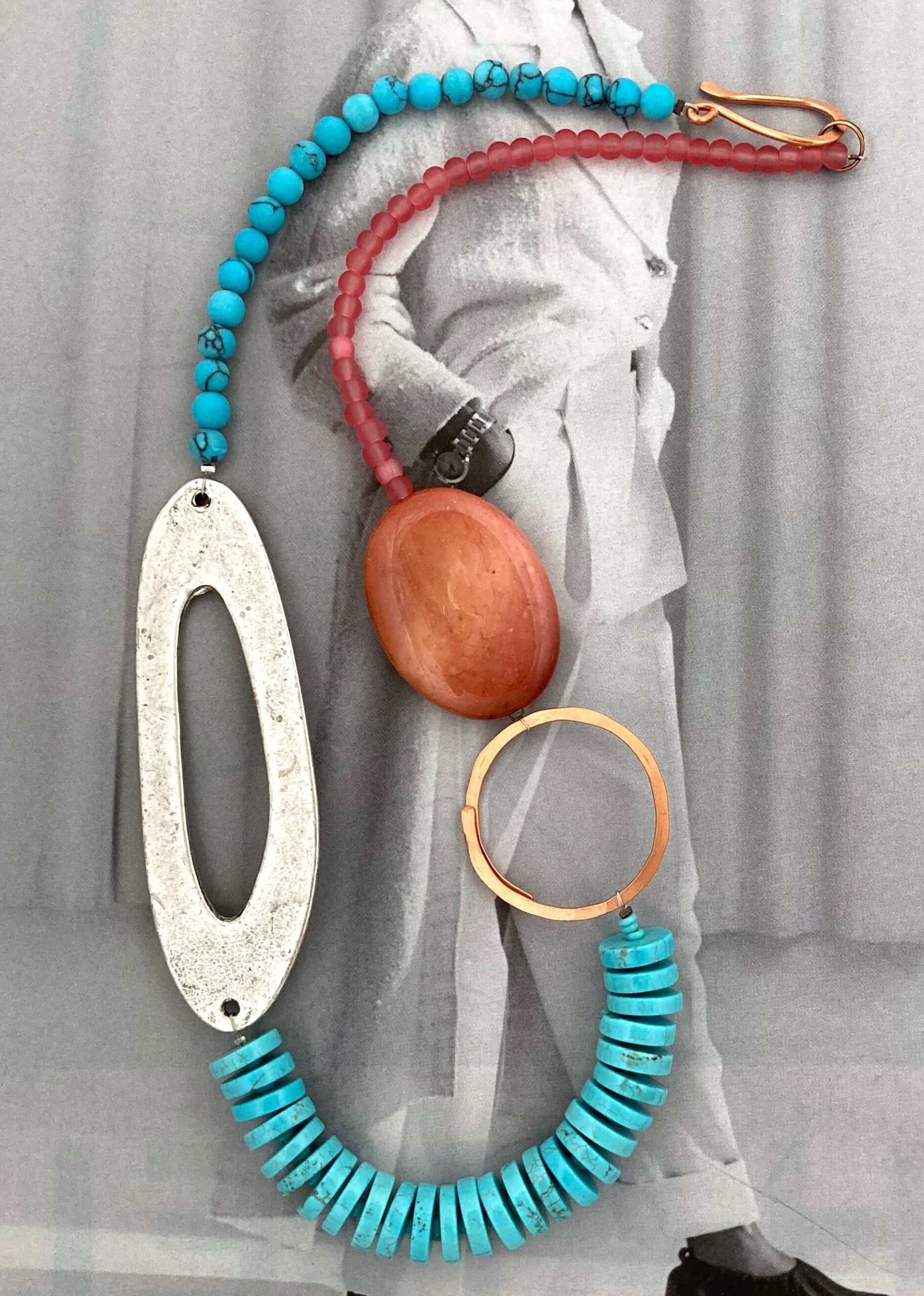 Turquoise, mookaite, hammered copper hoop, freeform silver metal oval necklace finished with hammered copper hook and ring clasp